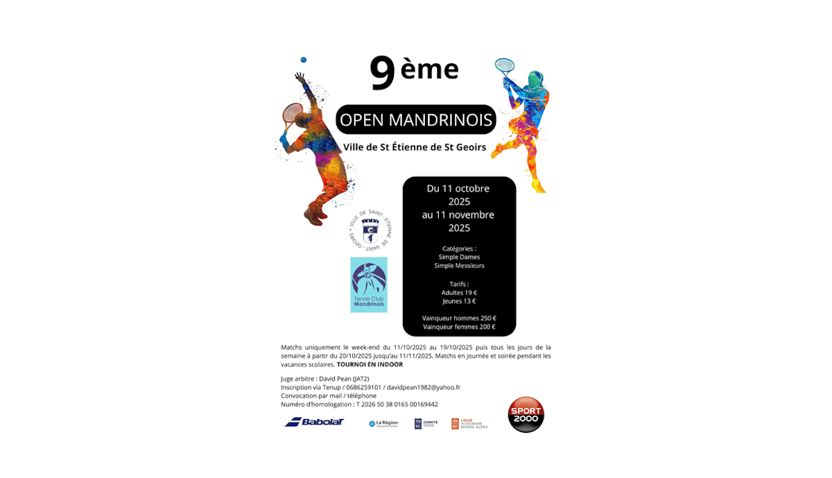 AccueilActualitésOpen TC MandrinoisOpen TC MandrinoisArticleTennis29 septembre 2025Agrandir l'imageSur le même sujetOpen Crolles JeunesArticleTennisOpen Crolles Jeunes16 octobre 2025Circuit Jeunes VoironArticleTennisCircuit Jeunes Voiron9 octobre 2025TC Uriage Poussins rougeArticleTennisTC Uriage Poussins rouge2 octobre 2025Voir tous les articles